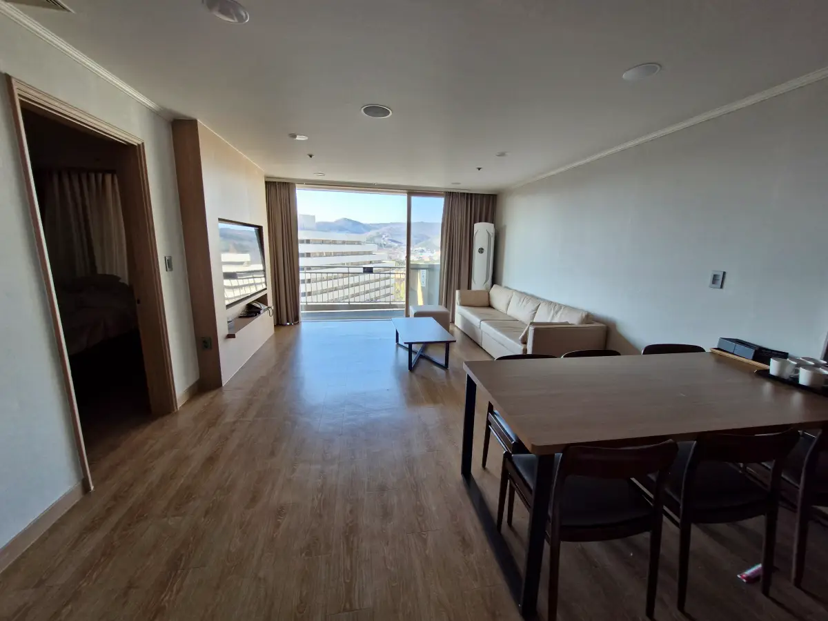 대규모 가족에게 안성맞춤인 거실1+방2+욕실1 형태의 객실 (6-8인/클린룸) 위치 : 본관