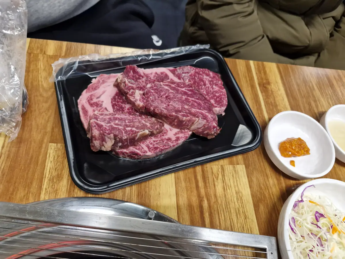 식당 옆에 한우 직판장이 있고 거기서 구매한 고기를 식당으로 와서 구워 먹는 방식입니다.