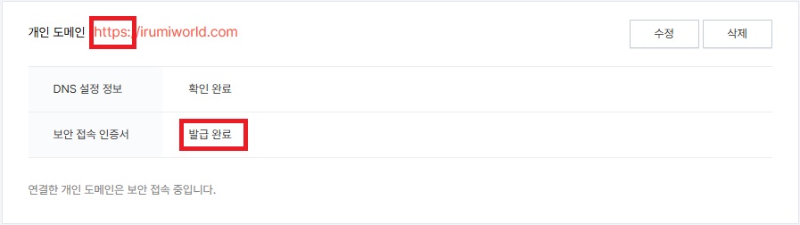 ① 티스토리 블로그 설정에서 보안 접속 인증서가 발급 완료 상태인가