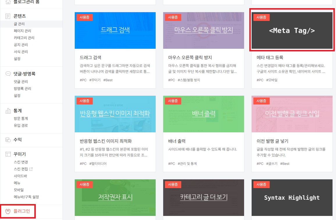 ③ 이제 티스토리 블로그 설정으로 가서 플러그인을 클릭 후 메타 태그 등록으로 갑니다.