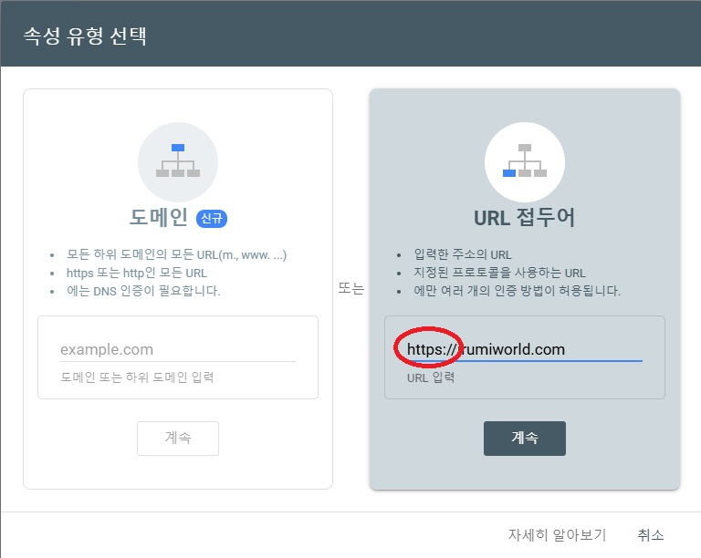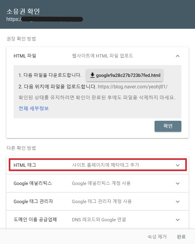 ② 구글 서치 콘솔에서 소유권 확인을 위한 절차를 시작합니다.
