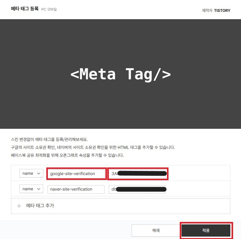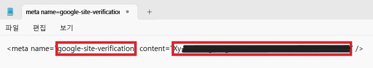 ④ 메모장에 복사해 두었던 메타 태그를 아래와 같이 추가해 주면 됩니다.