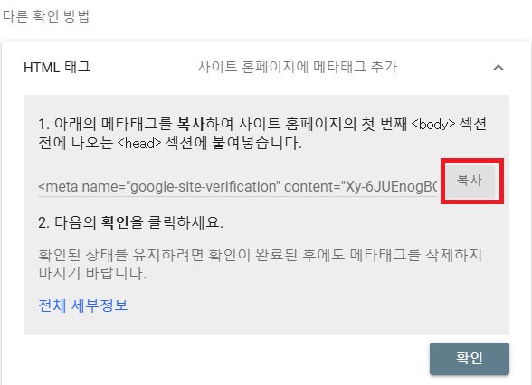 아래에 빨간색 박스에 있는 HTML태그를 선택하시고 HTML태그를 클릭 후 나오는 메타태그를 복사합니다.