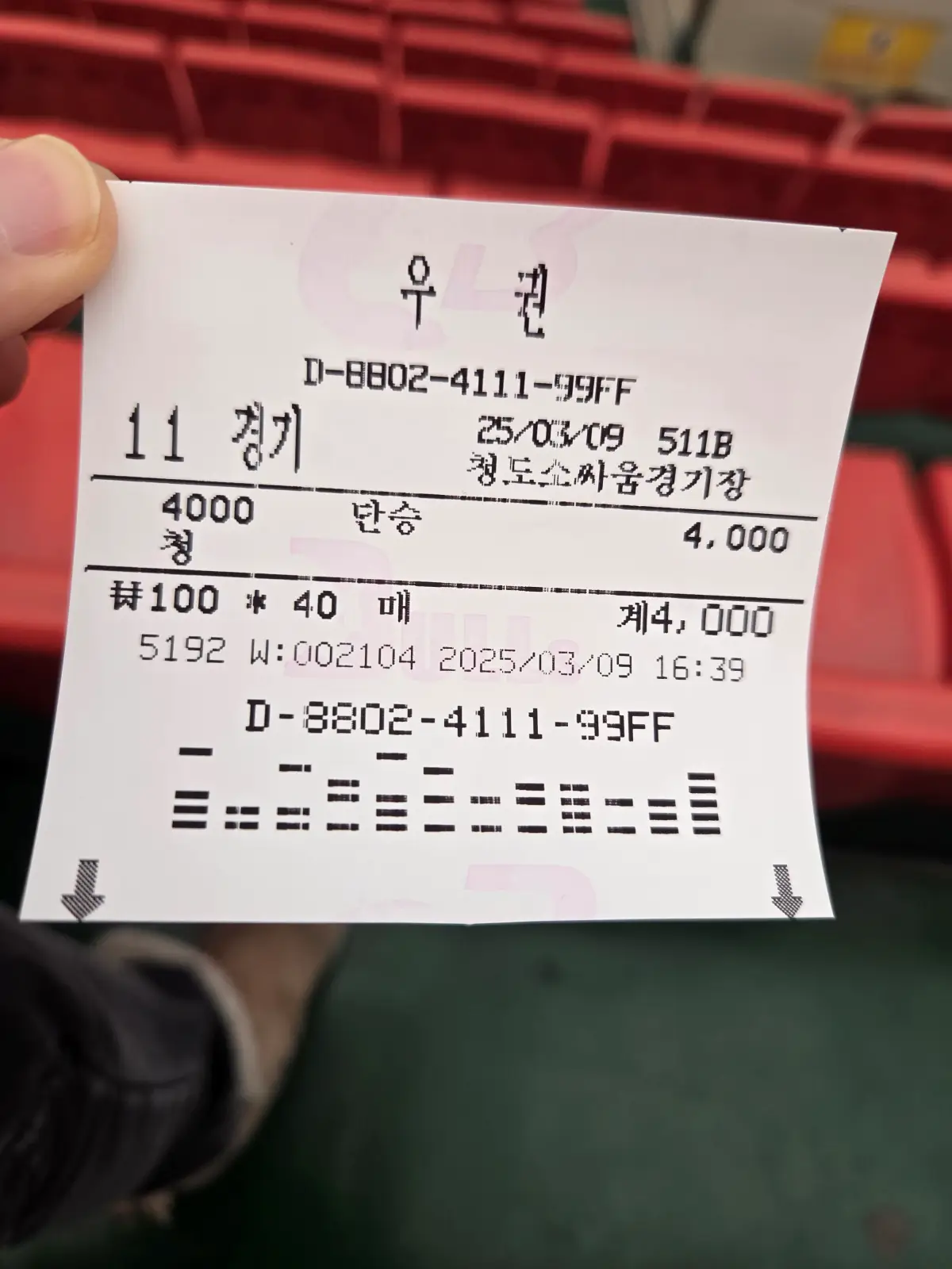 경기를 시작하기 전에 우권을 구입합니다. 로또 종이처럼 생긴 것에 홍팀, 청팀, 무승부 중에 선택해서 베팅을 합니다.